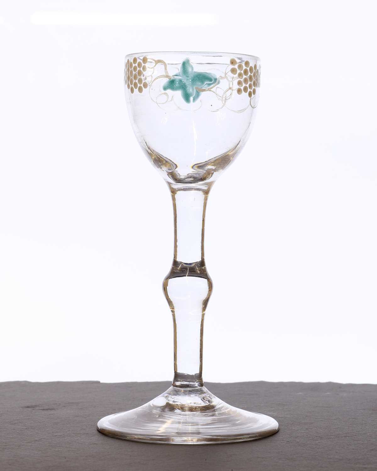 c.1765, with a cup-form bowl painted with a border of fruiting vine in opaque white, the leaves in opaque green, raised on a plain stem with a central knop and a conical foot,