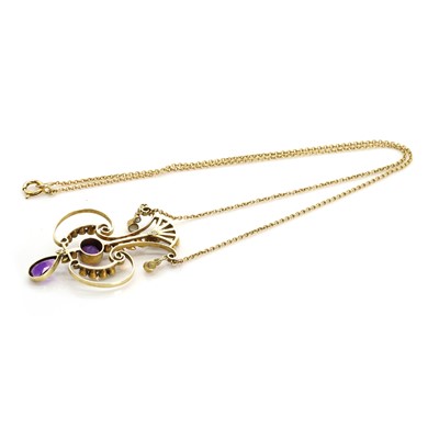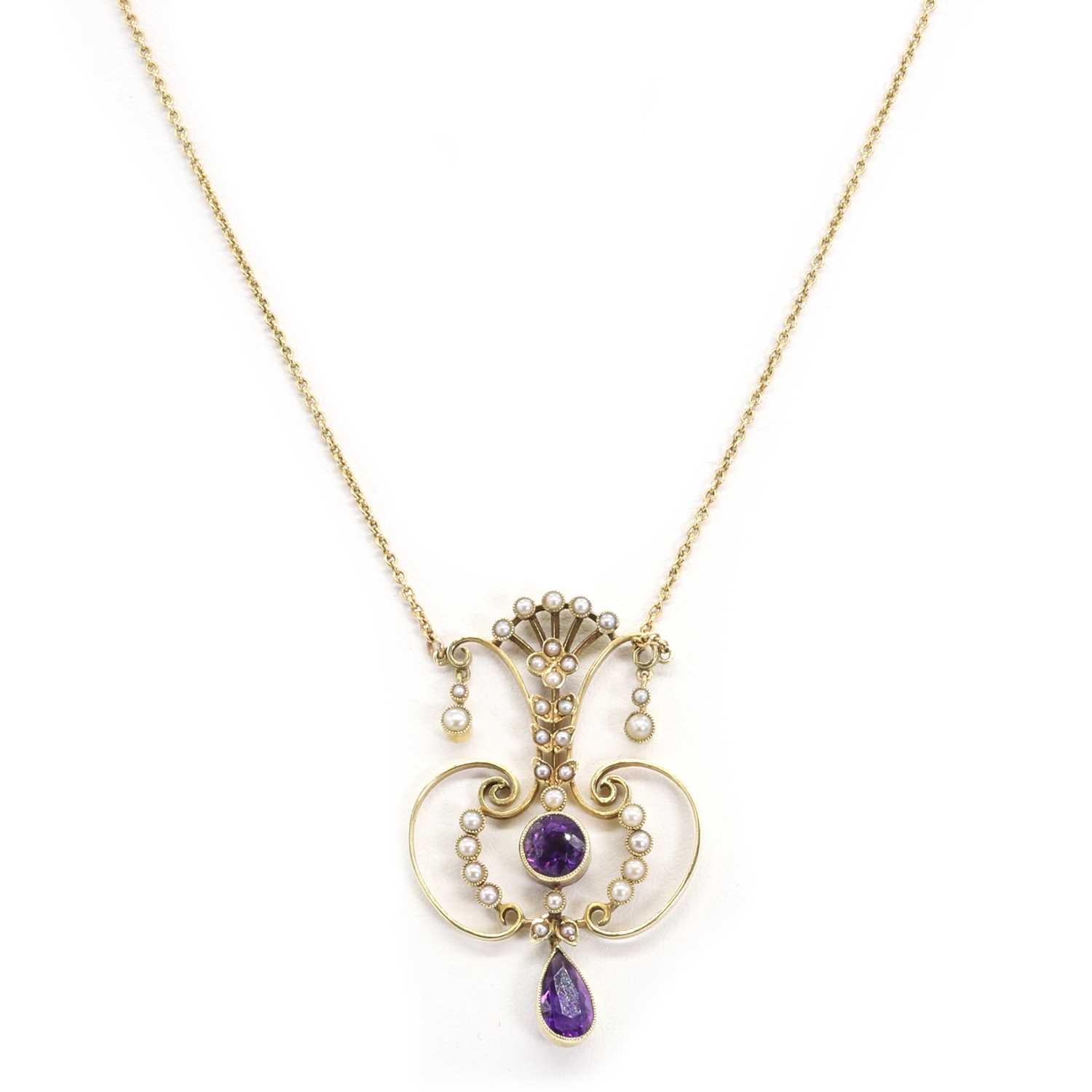 with a round cut amethyst, bezel set to a wire mount set throughout with split pearls, suspending a pear cut amethyst drop, 42mm long, stamped 15ct, suspended by a later cable link back chain, 390mm long, stamped 9CT, 7.15g