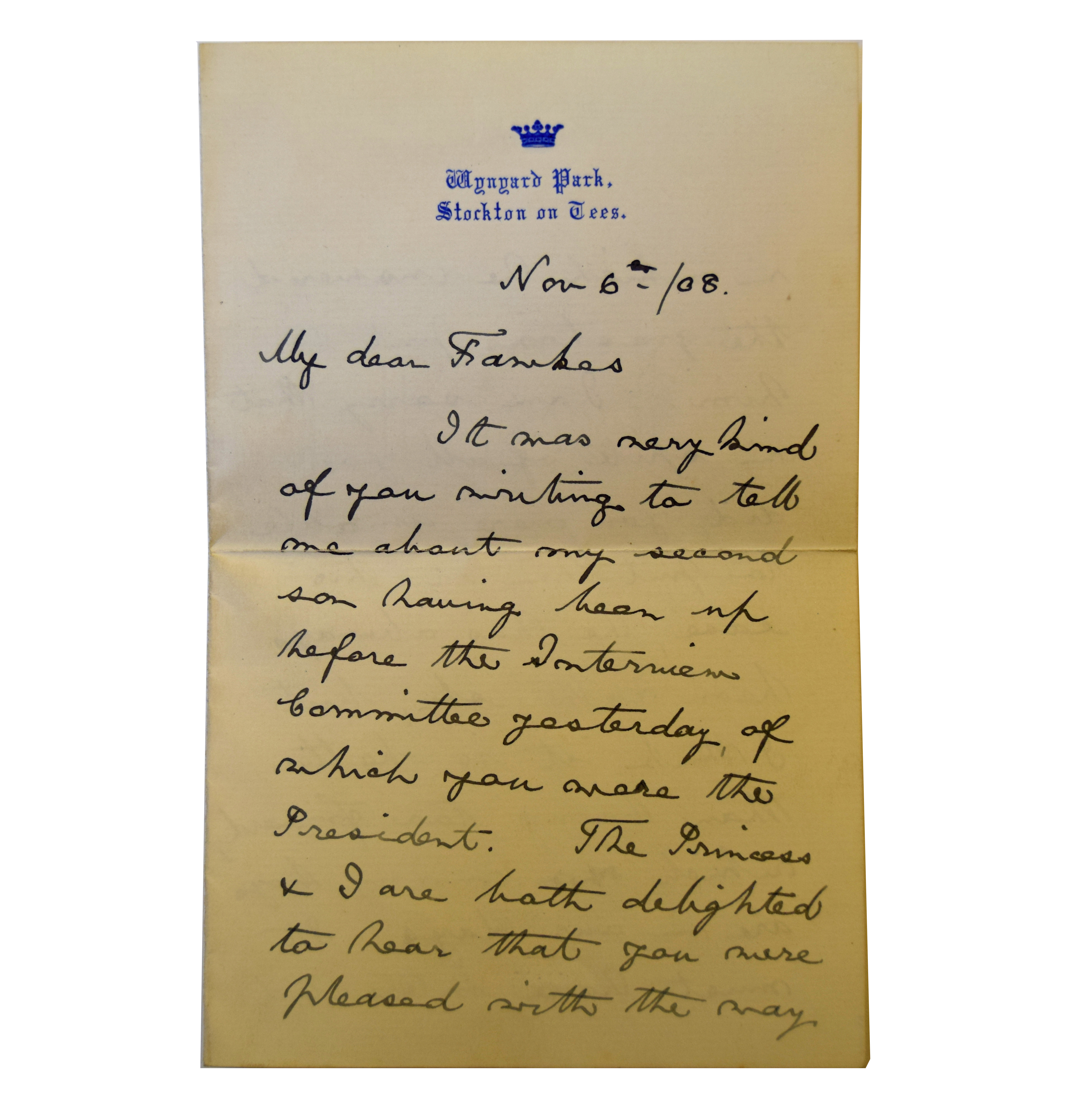 Written by Prince George (later George V) and dated November 6, 1908, the letter is addressed to Admiral Sir Wilmot Hawksworth Fawkes the day after Prince Albert (later George VI) attended the interview committee at Devonport as a 12-year-old.