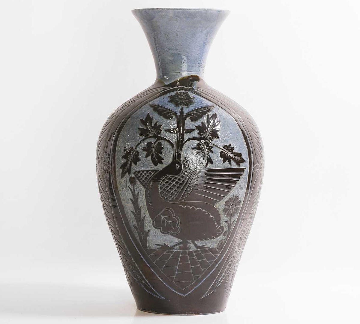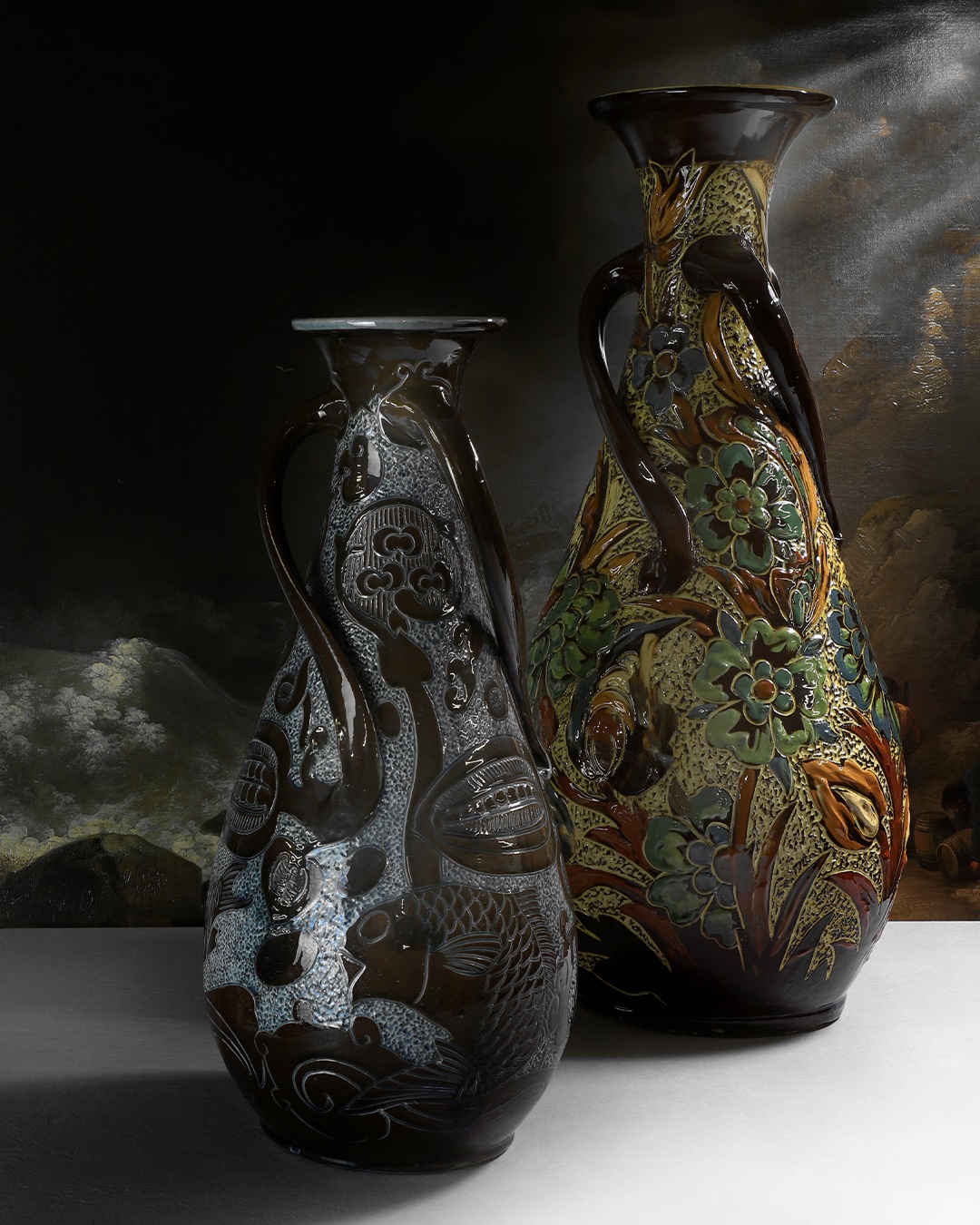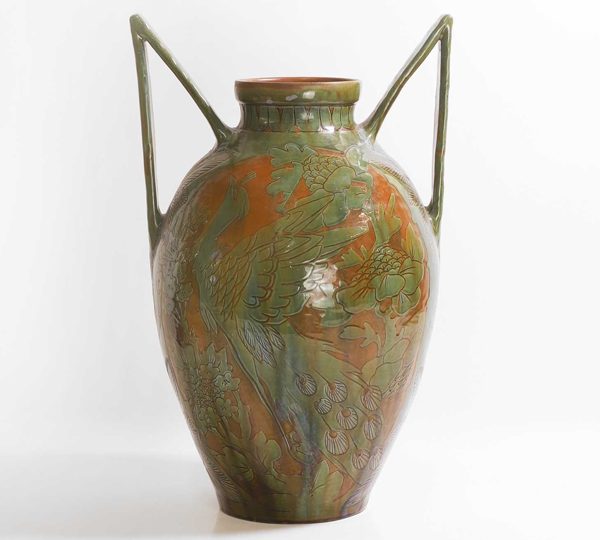 James Dewdney, one of the designers well represented in this collection from Norfolk, was Brannam's most notable designer, from the early years through to the turn of the century. His work is very aesthetic and was influenced by ‘Japonisme’ in the late 1870s and 1880s. Many of the works are of large proportions, and were often sold through Liberty’s of London.