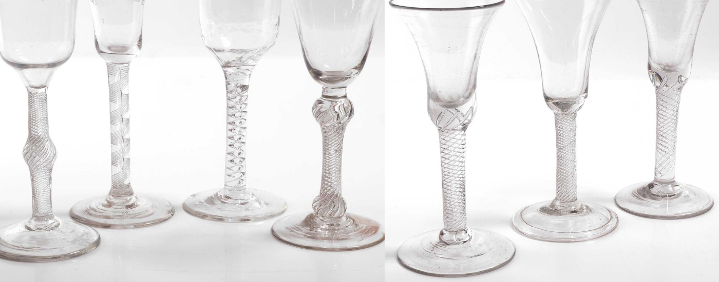 As we move further into the 18th century within the sale, the collection of air-twist wine glasses (Lot 12) offers a fascinating contrast. These elegant glasses demonstrate how glassmakers responded to external pressures, in this case, taxation. In 1746, under George II, the Glass Excise Tax was introduced, charging duty according to the weight of glass. This significant legislation forced craftsmen to rethink their methods. The introduction of the air-twist stem was not merely decorative; it was a practical solution to create lighter glasses which were more financially viable for the glassmakers.