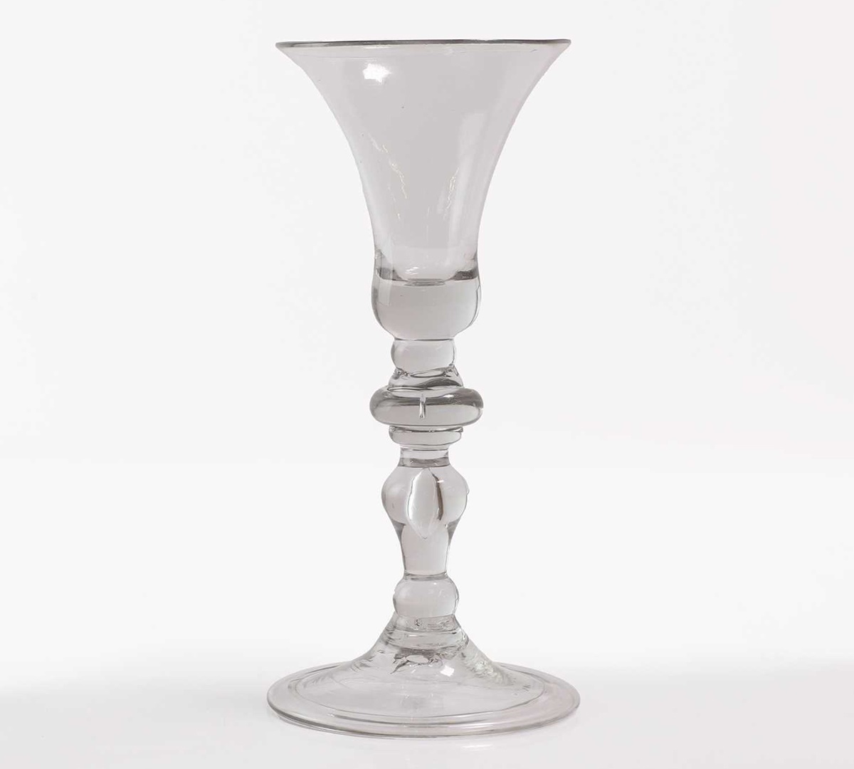 Reflecting on how these developments affect the market, glasses of the early 18th century are highly collectable, particularly those referred to as Heavy Baluster glasses. These pieces, prized for their deep grey colour, substantial weight, and impressive scale, are sought after for their rarity and presence – produced at a time when makers where not penalised for the object’s weight. They were also completely at odds with what had come before in the 17th century, when Façon de Venise glass, the light and delicate output manufactured across Europe, dominated the market.